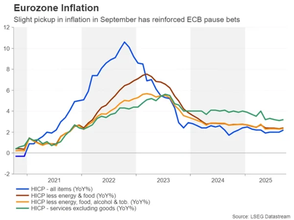 The European Central Bank will too be publishing the minutes of its September meeting, due Thursday. Headline inflation picked up from 2.0% to 2.2% in September, but the core measure that excludes food and energy rose slightly more than forecast to 2.4%, while service CPI edged up to 3.2%.