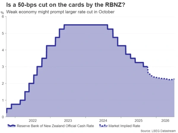 The swing towards a larger move came after the Q2 GDP figures, which showed an unexpected quarterly contraction of 0.9%. New Zealand’s economy has been struggling to grow since late 2022 but sticky inflation has been a concern. The annual CPI rate accelerated to 2.7% in the second quarter, and this may be the determining factor between a 25- and 50-bps cut.