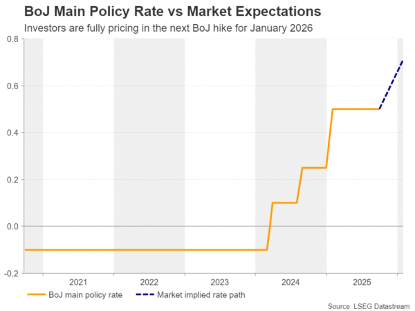 According to Japan’s Overnight Index Swaps (OIS) there is a strong 55% chance of a 25bps rate hike at the Bank’s upcoming decision, with the probability of that happening by the end of the year rising to around 80%. A hike is almost fully priced in for January.