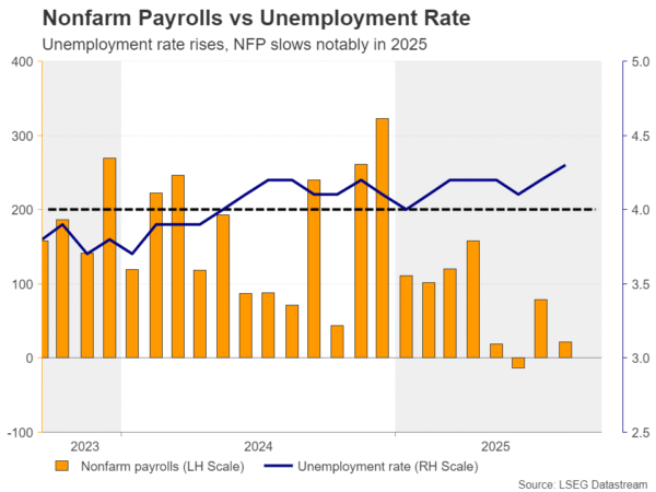 That said, since then, the unemployment rate declined to 4.2% in July and stayed there in August, and most importantly the monthly CPI y/y rate surged to 2.8% in July from 1.9% and rose even further to 3.0% in August. This encouraged market participants to push back expectations of the next quarter-point reduction, fully pricing it in for February 2026. For this meeting there is only a 7% chance of a cut, with the remaining 93% pointing to no action.