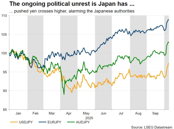 The yen has reacted slightly positively to the LDP-Komeito breakup, but Japan’s outlook has just become more clouded. The Japanese Finance Ministry, in cooperation with the BoJ, will most likely keep tabs on yen underperformance, but a new PM has to be elected soon. In the meantime, an October BoJ rate hike appears to be out of the question, but December remains a ‘live’ month.