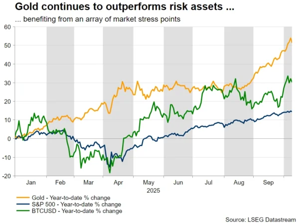 Following a Fed-dominated period, political risks have been monopolizing market attention. The US government shutdown and developments in both France and Japan have been fueling an atypical risk-off reaction, with the US dollar, gold and US equities surging. In particular, gold has been generating headlines with its continued rally, only to ease in the past two sessions on news of a ceasefire agreement in Gaza.