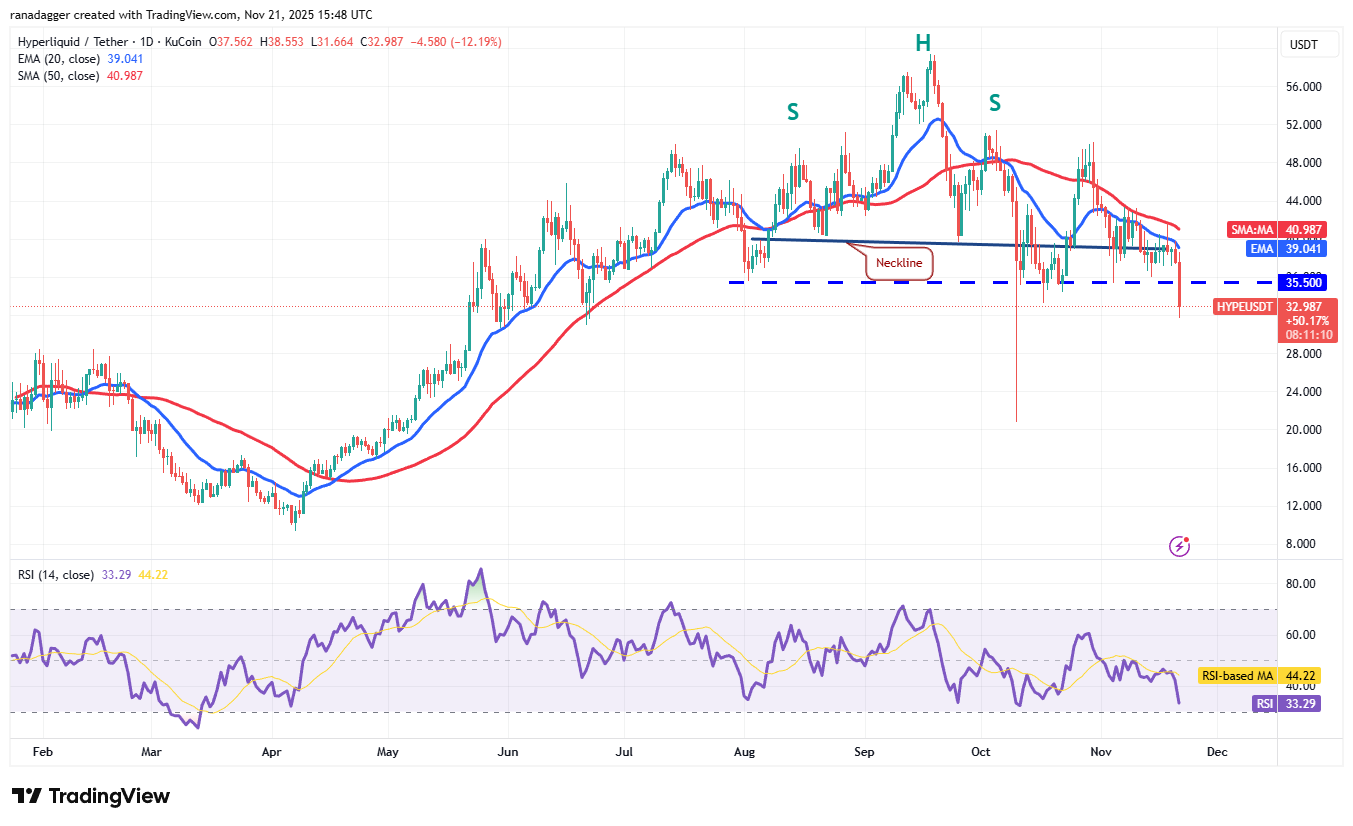 Hyperliquid (HYPE) tried to rise above the 20-day EMA ($39.04) on Thursday, but the bears held their ground.