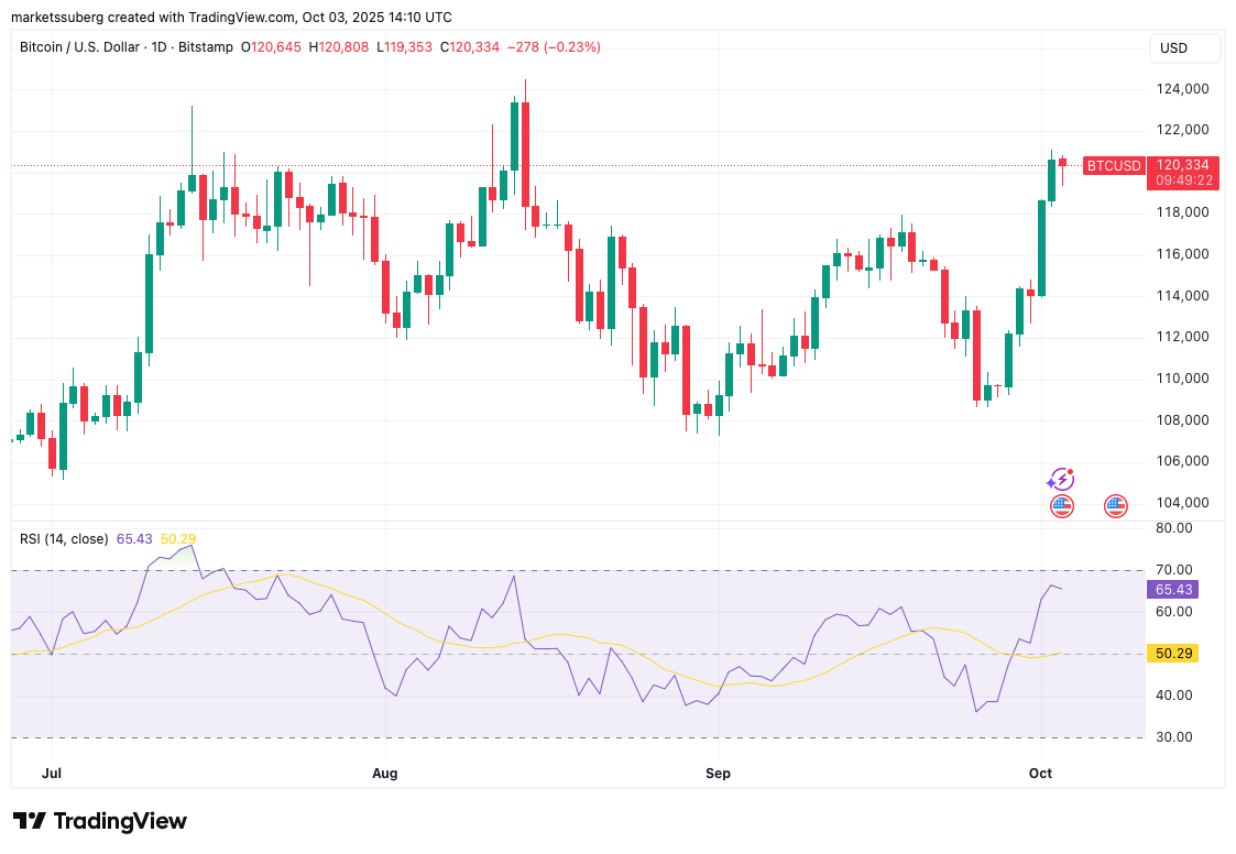 BTC/USD had hit new local highs into the daily close, with the level to beat now at $121,100.