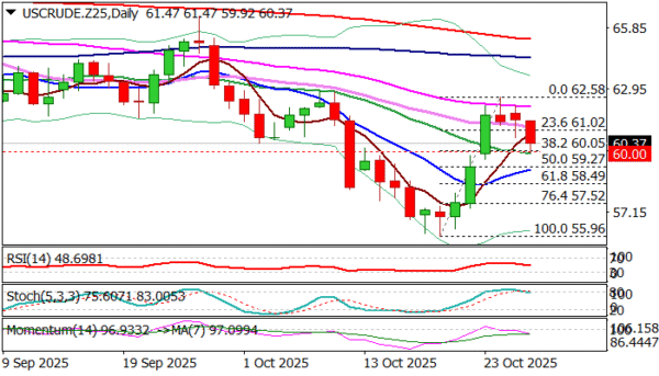 Fresh bears cracked important support at $60 (psychological / Fibo 38.2% of $55.96/$62.58 upleg / 20 DMA) but faced headwinds at this zone that so far prevented break lower.