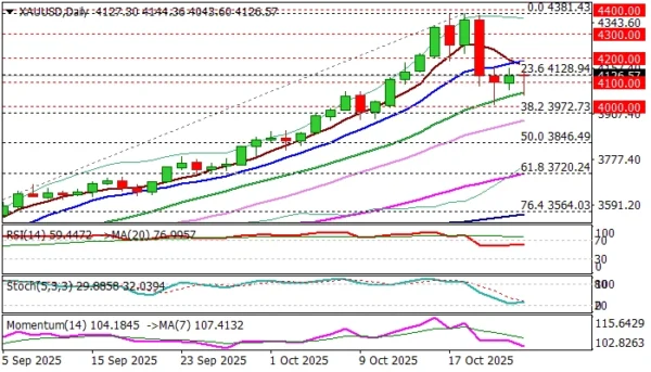 Metal’s price remains within the range of past three days after critical $4000 support contained sharp sell-off from new record high, but recovery attempts were so far limited and holding well below upper triggers at $4200 zone (daily Tenkan-sen / psychological) which previously acted as one of key supports.