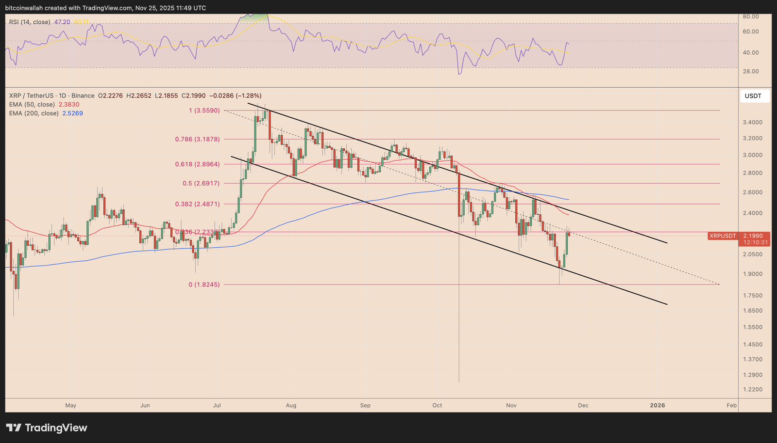 However, these EMAs sit almost exactly at the upper trendline of XRP’s descending channel, in a pattern that has guided the price lower since the summer.