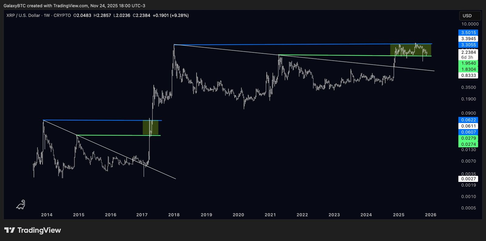 With prices stabilizing around $2 and buyers stepping back in, GalaxyBTC saw the potential for XRP to revisit the upper boundary near $3.30–$3.50, echoing the expansion phase that followed a similar technical setup in 2017.