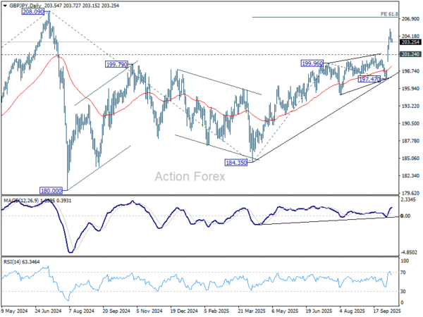 In the bigger picture, price actions from 208.09 (2024 high) are seen as a corrective pattern which might have completed at 184.35. Firm break of 208.09 high will resume the up trend from 123.94 (2020 low). Next target is 61.8% projection of 148.93 to 208.09 from 184.35 at 220.90. This will now remain the favored case long as 197.47 support holds.
