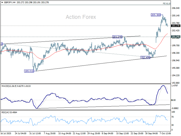 A temporary top was formed at 205.30 with current retreat, and intraday bias in GBP/JPY is turned neutral for consolidations. Downside should b contained above 201.24 resistance turned support to bring another rally. On the upside, break of 205.30 will resume the rise from 197.47 to 61.8% projection of 184.35 to 199.96 from 197.47 at 207.11.